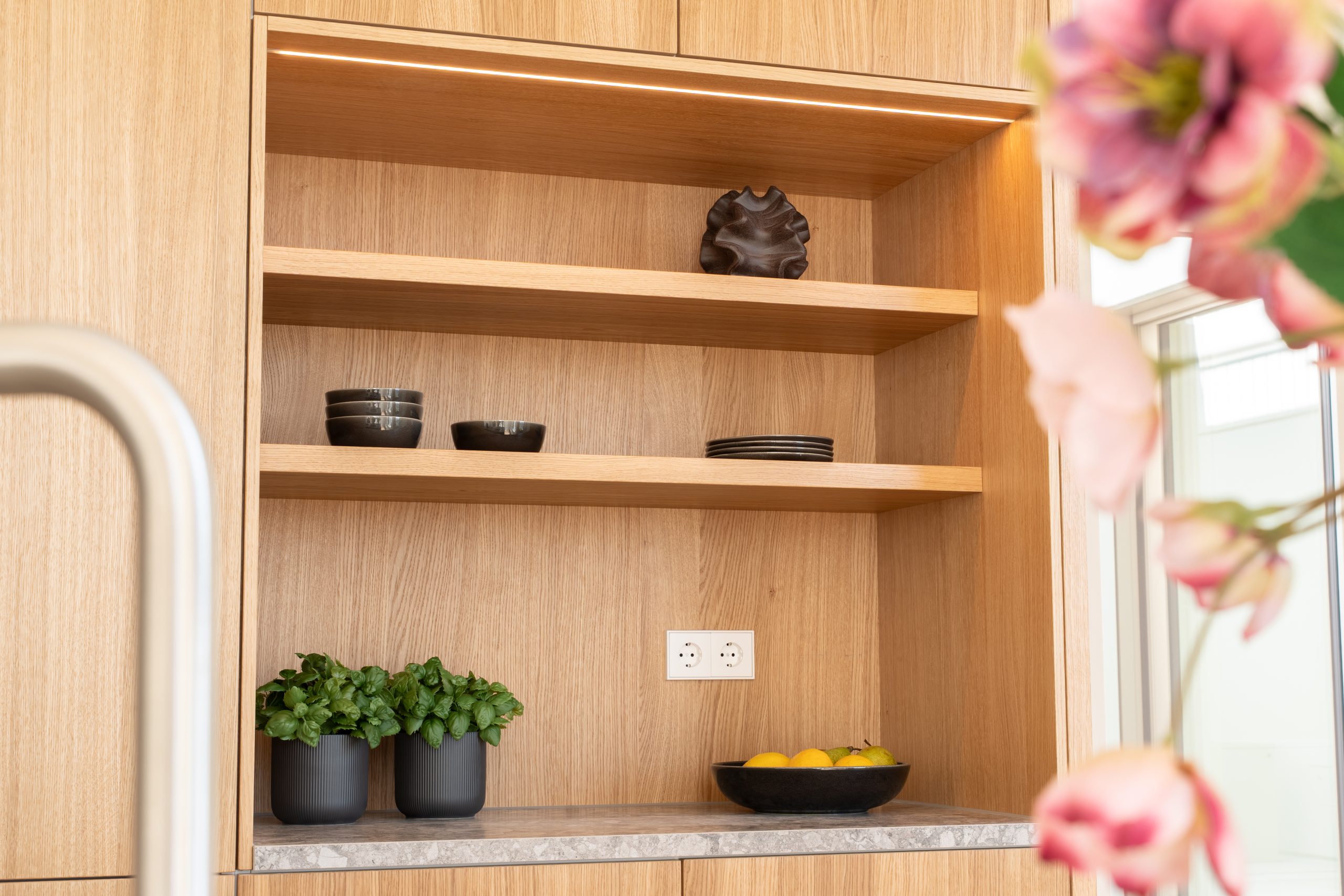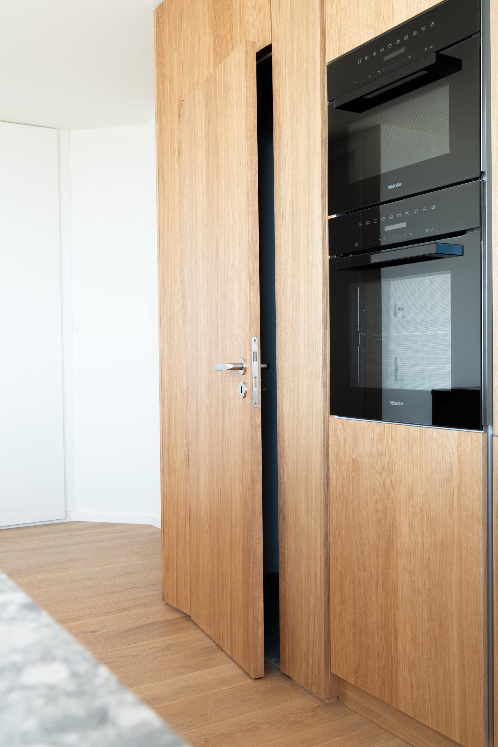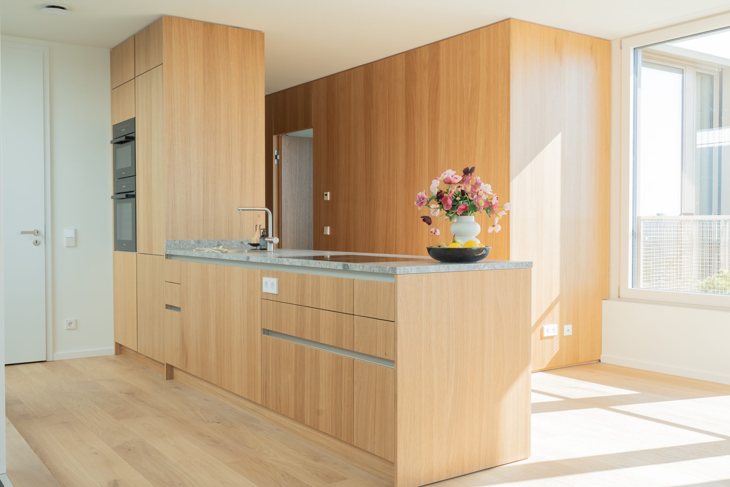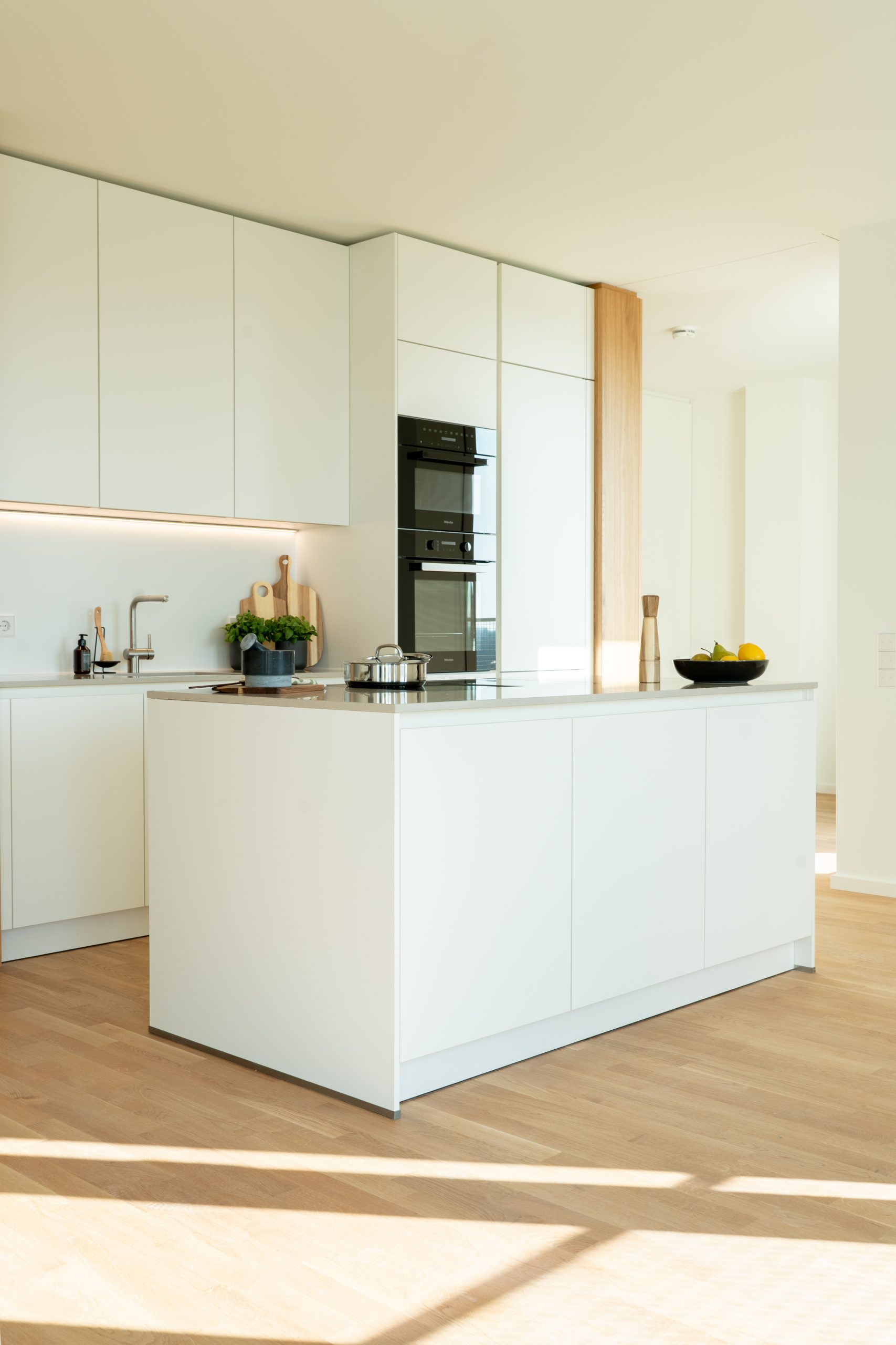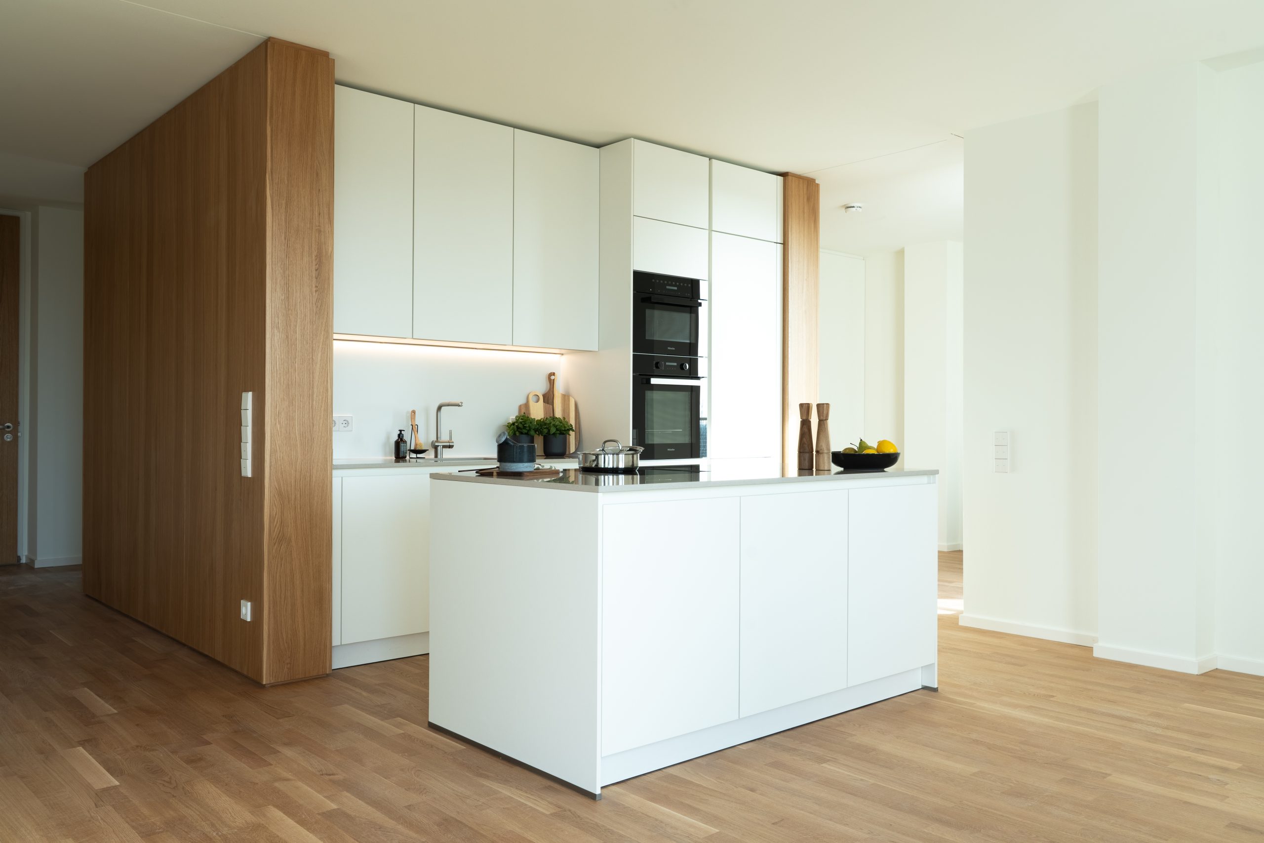 50 individuelle Wohnungen. 50 Küchen. Komplett geplant, geliefert und vollständig montiert. Ein besonderes Highlight ist die Echtholz-Wandverkleidung für eine hochwertige, individuelle Anmutung im Innenausbau, die wir in Zusammenarbeit mit einer regionalen Tischlerei umgesetzt haben. Von hoher Qualität zeugen die Natursteinarbeitsplatten, die ebenen Übergänge zur Spüle und Kochfeld sowie die harmonische Abstimmungen der Oberflächen, Dekore und Lichtinstallationen.